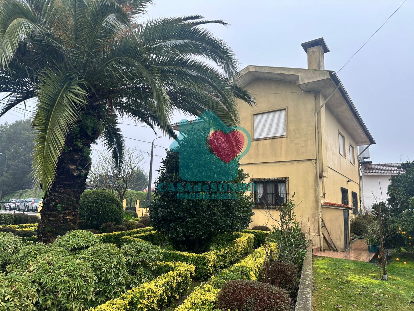 No exterior encontramos duas garagens, terreno com árvores de fruto e jardim.